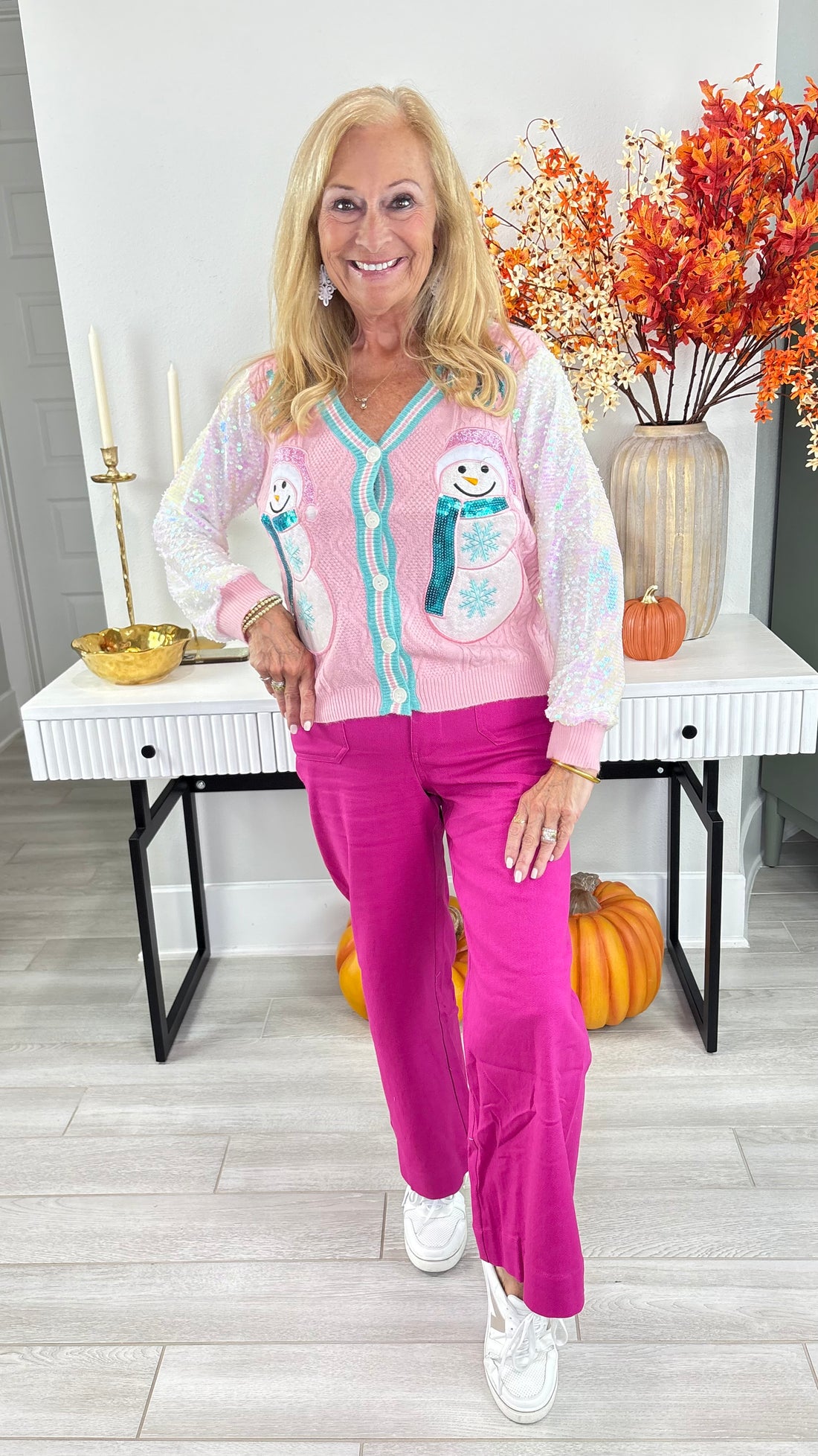Snowman Cardigan with Sequin Sleeves By Grace + Emma