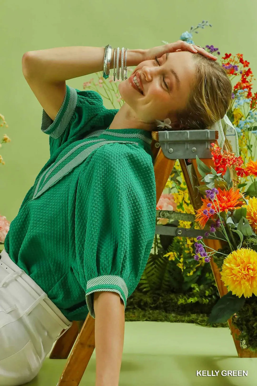 This top is the perfect mix of polished and playful. The texture adds dimension, the contrast trim makes the color pop, and the puff sleeves create a flattering, feminine silhouette. It pairs effortlessly with jeans, trousers, or skirts making it your new go-to top for brunch, work, outings, or any moment you want to feel cute and put together